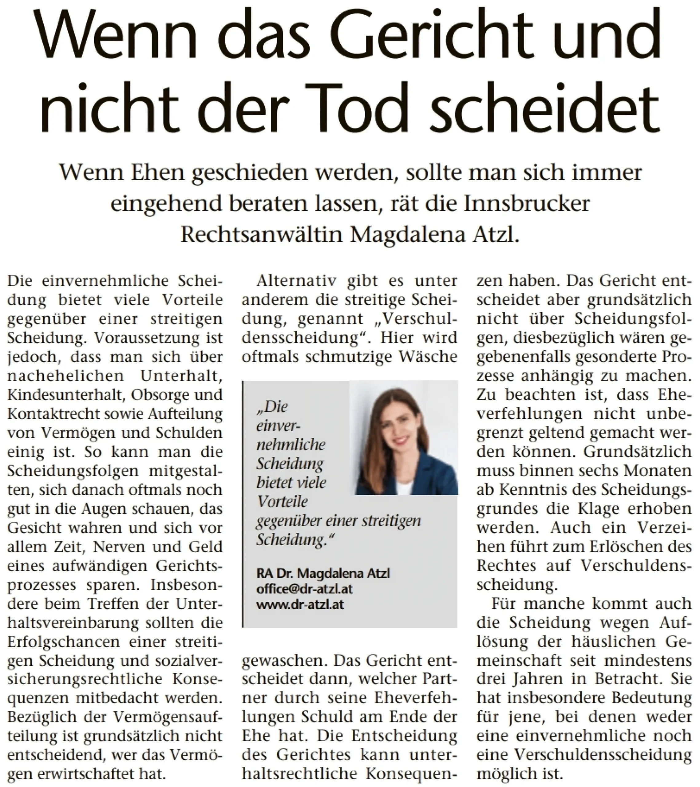 Als Scheidungsanwältin beschäftige ich mich täglich mit Ihren privaten Problemen und dem Finden von für Ihre Lebenssituation passenden Lösungen. Ich setze im Rahmen der einvernehmlichen Scheidung Scheidungsvereinbarungen mit den Inhalten Ehegattenunterhalt, Aufteilung des ehelichen Vermögens, Obsorge, Kontaktrecht und Unterhalt betreffend die minderjährigen Kinder auf. Es gibt nicht die eine Scheidungsberatung oder Scheidungsvereinbarung. Es braucht eine maßgeschneiderte Lösung, die wir gemeinsam erarbeiten.